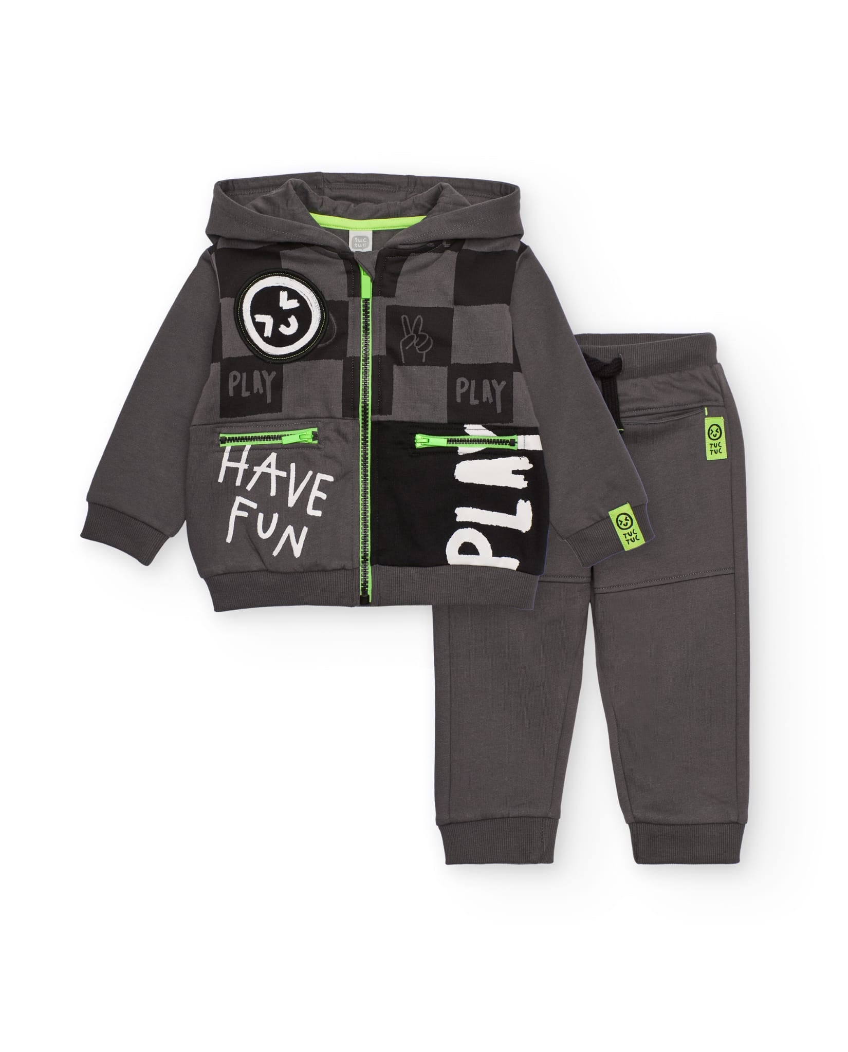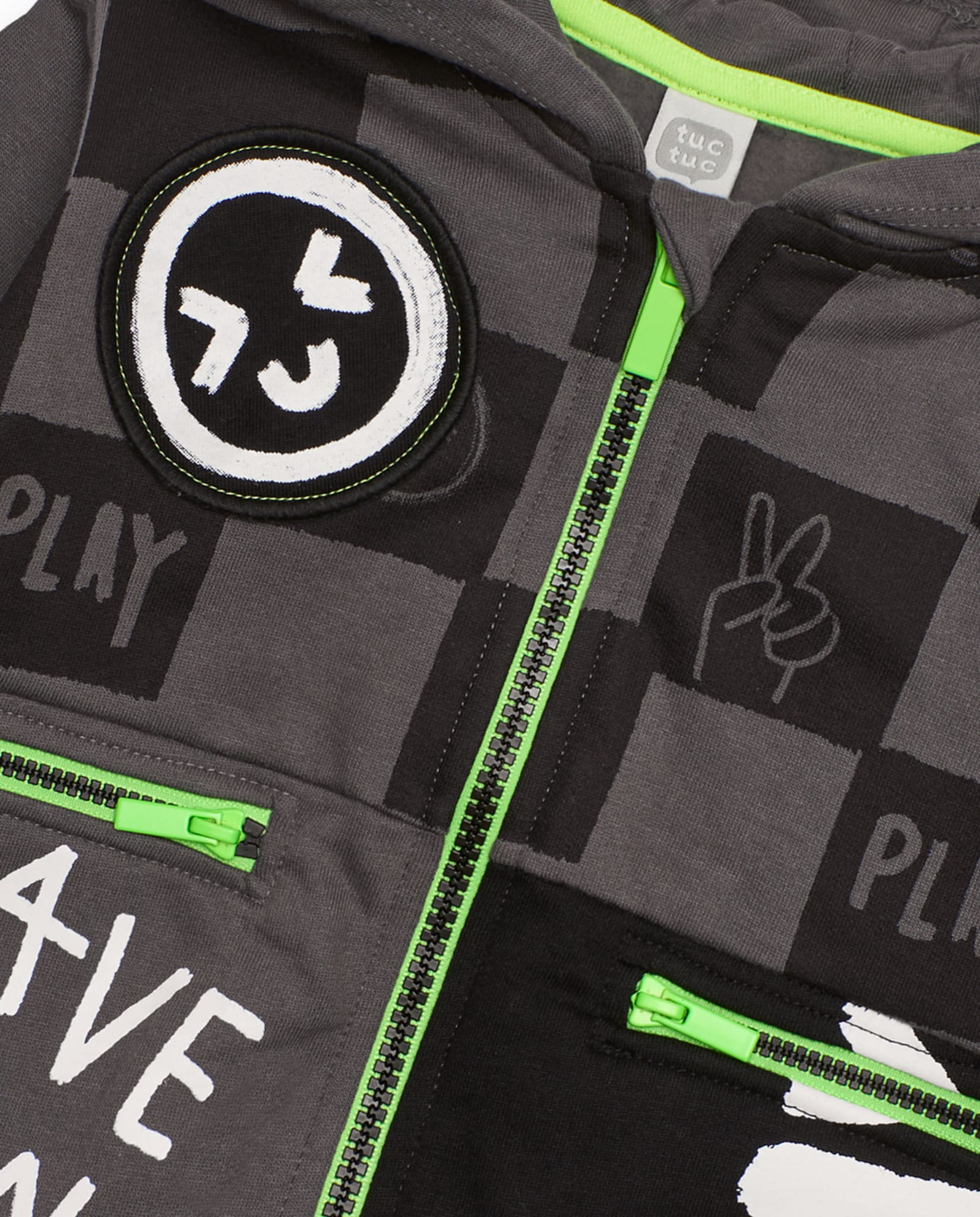 Este chándal infantil combina comodidad y estilo con una sudadera gris de cuadros negros, equipada con cremallera y capucha para adaptarse a todas las ocasiones. Los detalles en verde fosforescente aportan un toque moderno y divertido, mientras que las letras "play" y "have fun" refuerzan su espíritu lúdico. Perfecto para que los niños se muevan con libertad y luzcan a la moda en sus actividades diarias.