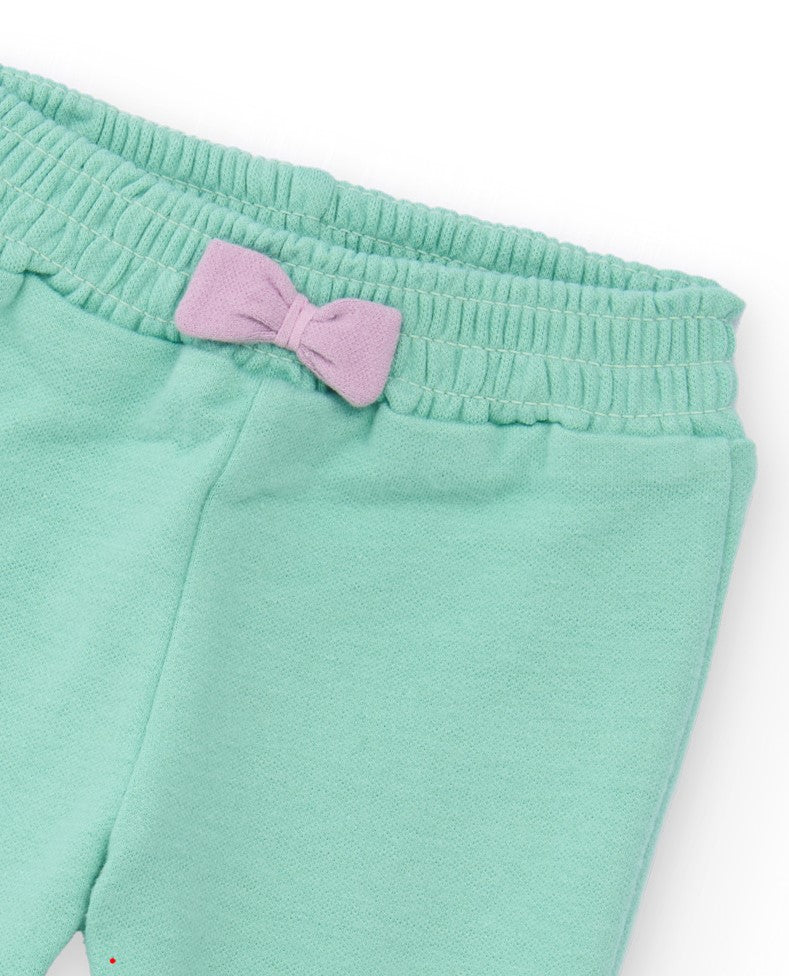 Este conjunto para bebé de la marca Tuc Tuc combina suavidad y diseño pensado para la comodidad de los más pequeños. La sudadera blanca presenta botones en la espalda para facilitar el vestuario, con un delicado estampado de una carita de ovejita en tonos verde agua y malva, con orejitas en relieve que aportan textura y detalle. El pantalón en verde agua cuenta con cintura elástica y un lazo malva que aporta un toque elegante y ajustable para el máximo confort diario. Ideal para el cuidado y estilo de tu bebé.
